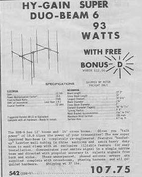Hy-Gain Super Duo-Beam 6 (542) Make Hy-Gain Model SDB 6 Catalog # 542 Year ~1972 Orig Price $107.75 (1972) Description Hy-Gain Super Duo-Beam 6 HY-GAIN ANTENNAS Hy-Gain Super Duo-Beam 6 – Henshaw’s 1972-1/2 Catalog